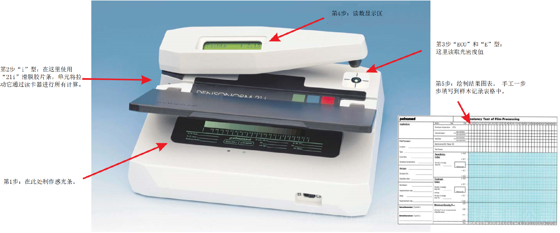 每个单元产生日常质量控制所需的信息,所有工作都在设备读取胶片条后几秒钟完成。 这节省了时间并消除了胶片质量保证的麻烦。配置一个 21阶的胶片特性曲线的标准胶片