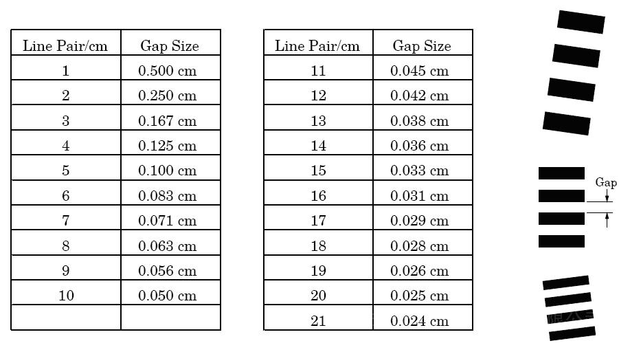21 线对/厘米高分辨率线对卡可用于分辨率检测,它的分辨率量程从 1 个线
