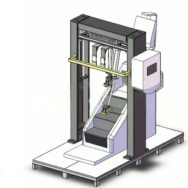 1. 步态校准:通过多自由度机械臂模拟真人爬楼轨迹(踏板升降高度 15-25cm,前后平移距离 30-40cm,适配不同楼梯机踏板间距),调整机械臂动作与楼梯机踏板运动节奏匹配,确保接触位置精准。2. 动态加载:启动伺服电动缸与步进电机,按照设定的载荷波形、峰值、步频输出动态载荷,实现 “踩压 - 释放 - 移位” 的循环动作,模拟连续爬楼过程。